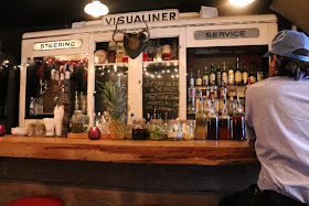 I especially love the bar area made from an old Detroit tire sign.